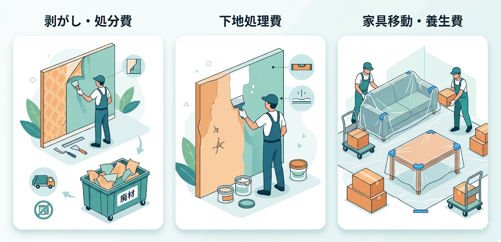 クロス張り替えの見積もりでは、クロス代以外に発生する追加費用を事前に把握しておかないと「思っていたより高くなった」と感じてしまう原因にもなります。ここでは、クロス代以外に発生する追加費用の内訳について解説します。