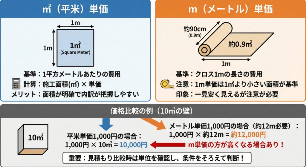 クロス張り替えの見積もりで使われる単価には、「㎡(平米)単価」と「m(メートル)単価」の2種類があります。どちらもクロスの価格を示す指標ですが、基準となる面積が違うため同じ数字でも実際の費用が異なります。