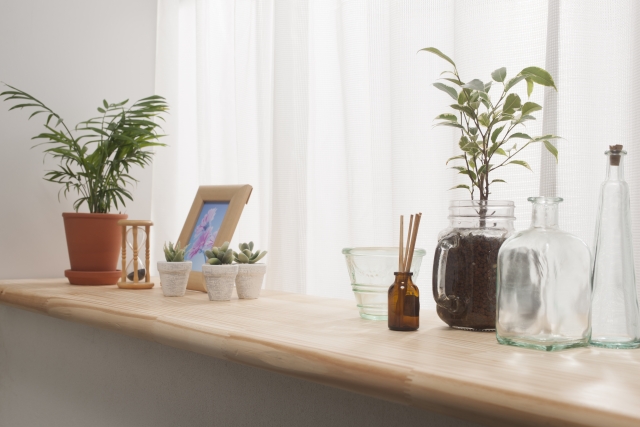 出窓は室内の中でも自然光が入りやすく、植物や小物を飾るディスプレイスペースとして活用できます。見栄えよく整えるコツは、高さの違いをつけることと、素材のテイストを揃えることです。背の高い植物と低めの小物を組み合わせたり、小さな台やトレーで段差をつくったりすることで、奥行きのあるディスプレイになります。